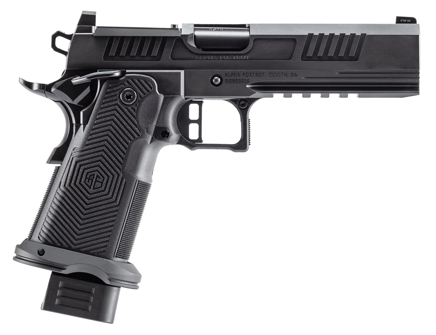 The AF1911 Romulus delivers full-size performance with Alpha Foxtrot’s modern 2011-style engineering. Featuring a black polished DLC finish on the frame and slide; Bull barrel; Night Fision sight; Picatinny rail; ambidextrous thumb safety; flared magwell and is RMSC/RMR optics cut. Includes MOS adapter plate, RMSC and RMR plate, 17rd and 20rd magaine.