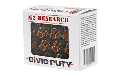 Typical bonded hollow point bullets over penetrate, leading to insufficient energy transfer, damage and trauma inside the intended target. G2 Research has taken its innovative Trocar design of the solid copper R.I.P. fragmenting projectile and adapted it to the G2 Research Civic Duty expanding self-defense round. The Civic Duty round defeats barriers as effectively as the R.I.P. and expands 2.5 times its initial diameter after coming into contact with a fluid medium. The Civic Duty round expands to transfer 100 Percent of its energy to the target. The Civic Duty Round retains 99.9 Percent weight inside the intended target without concern of over penetration in CQB situations.