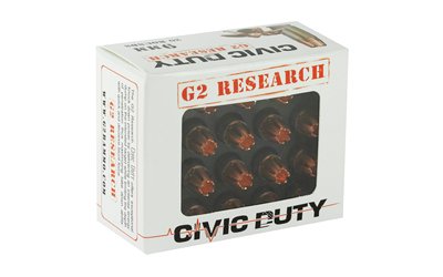 Typical bonded hollow point bullets over penetrate. G2 Research has taken its innovative Trocar design of the solid copper R.I.P. fragmenting projectile and adapted it to the G2 Research Civic Duty expanding self-defense round. The Civic Duty round defeats barriers as effectively as the R.I.P. and expands 2.5 times its initial diameter after coming into contact with a fluid medium. The Civic Duty round expands to transfer 100% of its energy to the target. The Civic Duty Round retains 99.9% weight inside the intended target without concern of over penetration in CQB situations.