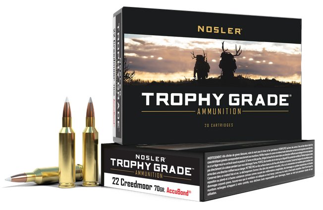 Loaded with a 70gr Spitzer AccuBond® Bullet and Nosler® Premium Brass – Nosler Trophy Grade ammunition is loaded with Nosler AccuBond® bullets. The AccuBond®s unique white polymer tip assures accuracy and smooth chambering while the boat-tail base at the rear of the bullet acts as a platform for large diameter mushrooms. Designed for accuracy near or far Nosler’s Trophy Grade ammunition provides undeniable reliability. – Cartridge 22 Creedmoor – Ammunition Use Deer Sized Game – Bullet Profile Spitzer – Bullet Type AccuBond – Bullet Weight 70gr – Lead Free No – Test Barrel Twist 1-8