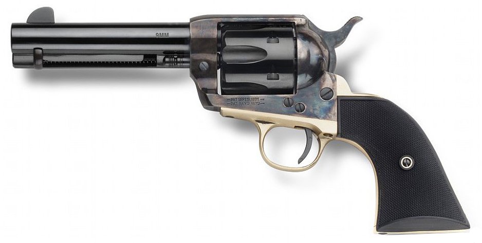 9MM CALIBER – 4 3/4 BARREL LENGTH – CASE HARDENED FRAME – BRASS BACKSTRAP AND TRIGGERGUARD – BLACK 2-PIECE CHECKERED BLACK PLASTIC GRIP
